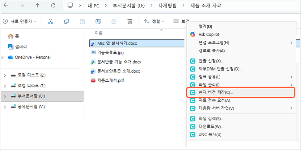 1. 윈도우 탐색기에서 원하는 파일을 선택한 후 마우스를 우클릭하여 현재 버전 저장 메뉴를 선택합니다.