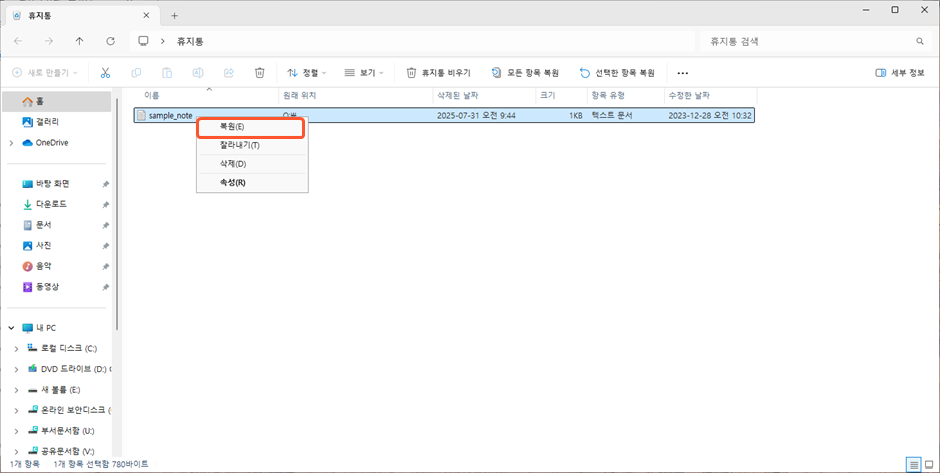 삭제한 파일은 Windows 휴지통에서 확인 및 복구할 수 있습니다.