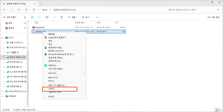 온라인 보안디스크에서 삭제할 파일을 우클릭 - 휴지통으로 보내기(S)를 클릭합니다.