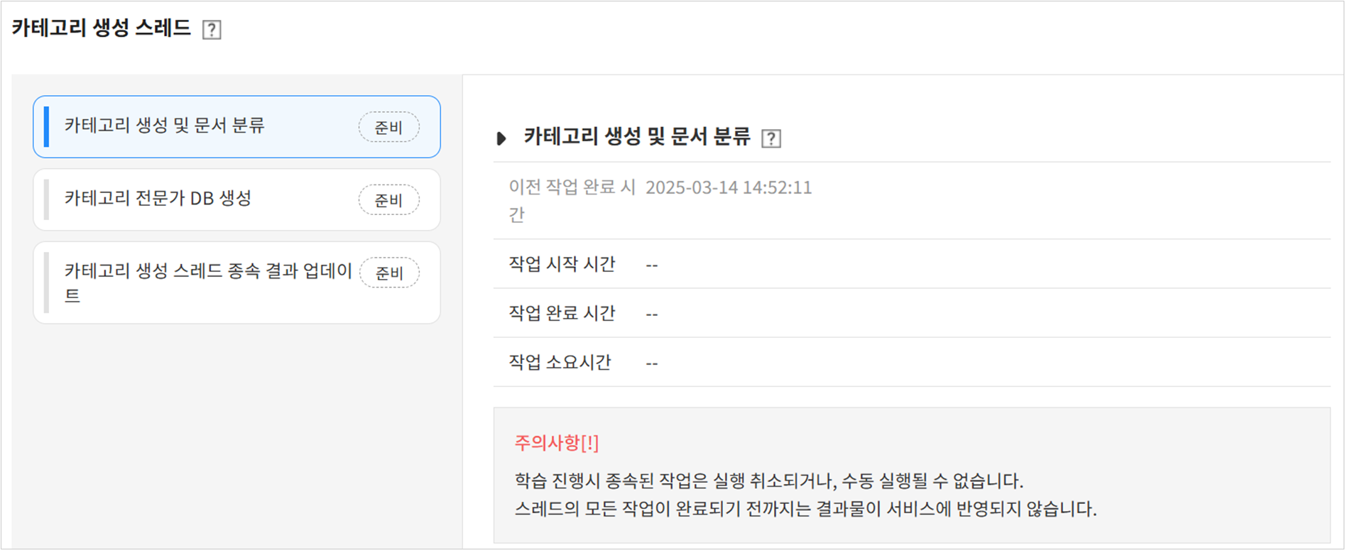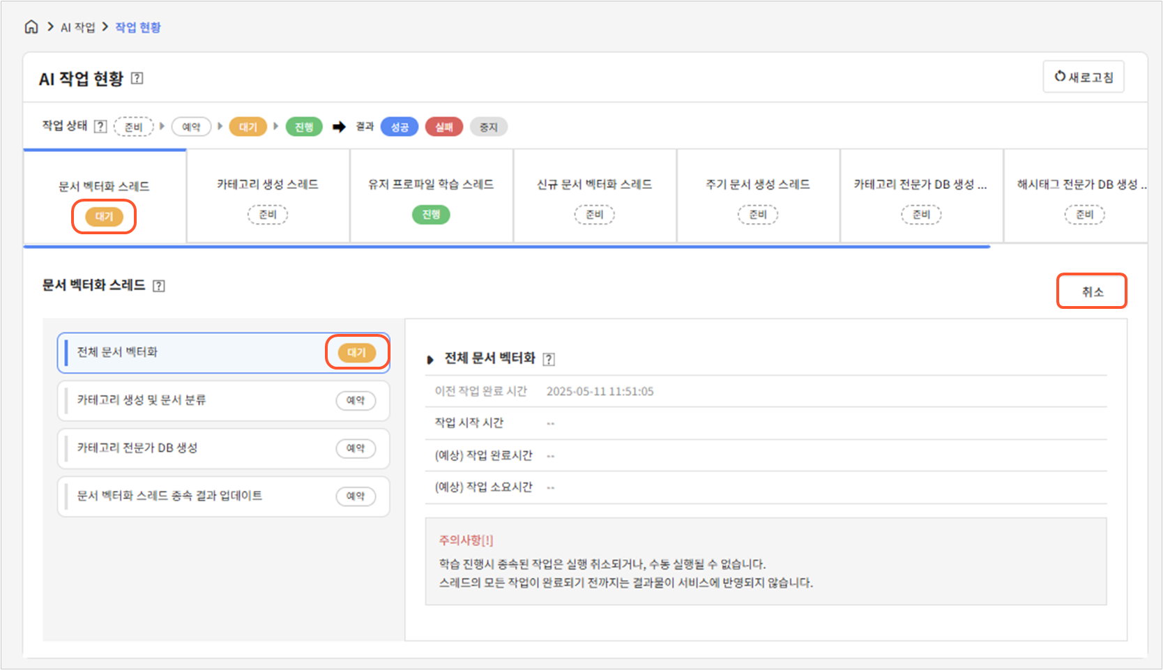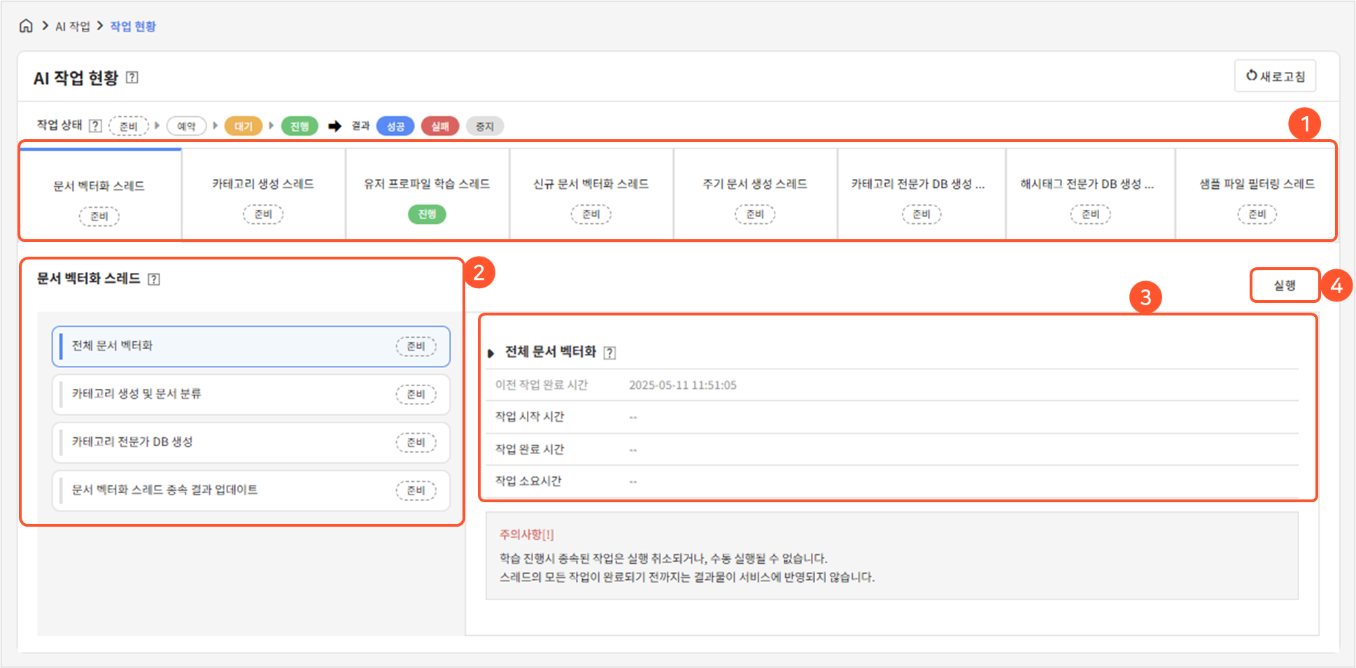 위해 전체 문서 벡터화 이후 종속되는 작업들을 정해진 순서대로 진행합니다. 관리자에 의해 수동으로 실행되며, 위의 AI 작업 현황 페이지에서 실행 버튼을 클릭하여 실행할 수 있습니다. (위의
