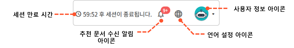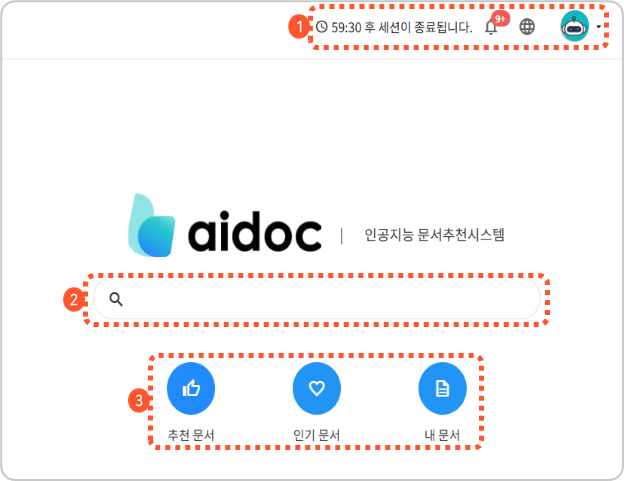 aidoc 윈도우 에이전트 화면 구성과 에이전트 화면에 표시되는 추천 알림에 대해 살펴봅니다. 화면 구성 aidoc 윈도우 에이전트 화면은 ❶ 상단 메뉴 영역, ❷ 추천 정보 영역, ❸ 모두 보기 영역으로 구성되어 있습니다. ❶ 상단 메뉴 영역 문서 검색 창 문서 검색 창에 검색어를 입력한 후 Enter를 누르면 검색이 실행되고 검색 결과를 보여주는 웹 서비스 화면으로 이동합니다. 문서 검색 및 검색 결과를 확인하는 방법은 aidoc ...