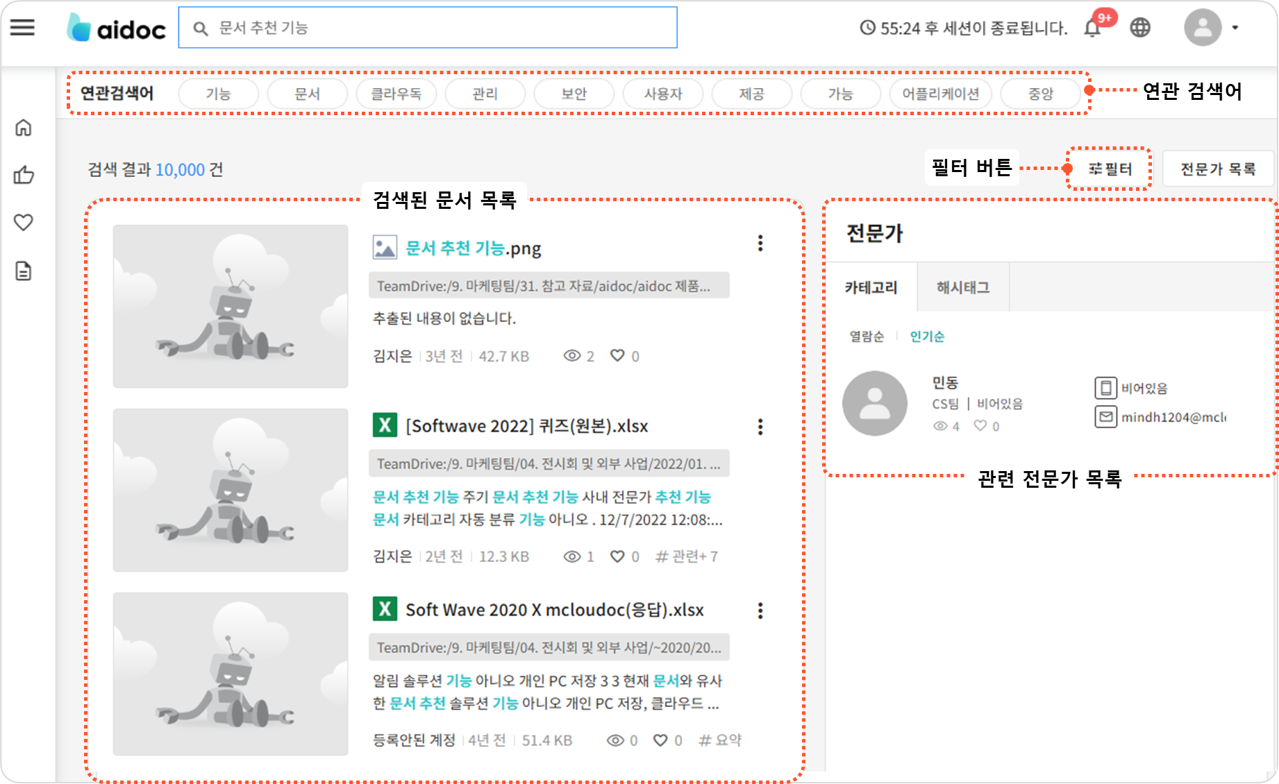 인공지능 지식관리 서비스인 aidoc 사용자 서비스는 사용자의 업무 효율을 높일 수 있는 다양한 추천 및 검색 기능을 제공합니다. 사용자가 열람 중인 문서를 기반으로 유사한 문서를 추천하며, 관련 전문가도 추천합니다. 주기적으로 작성하는 문서를 추천하여 꼼꼼한 업무 수행을 도와주기도 합니다. 전문 검색 기능은 검색어 입력시에 자동 완성 기능을 제공하고, 검색 결과에는 연관 검색어와 관련 전문가도 추천합니다 . aidoc 사용자 서비스 주요 기능 ...