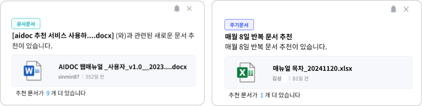 알림 창에는 추천 문서의 이름과 작성자, 최종 수정일 등 간략한 문서 정보가 표시되며, 문서 이름을 클릭하면 바로 열람할 수 있습니다.