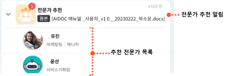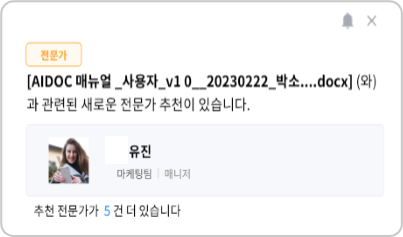 열람 문서의 전문가 추천 알림에는 추천 전문가 목록이 표시되고, 전문가를