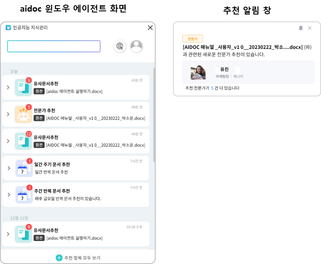 같은 aidoc 윈도우 에이전트 화면과 추천 알림 창을 통해 사용자에게 안내됩니다.