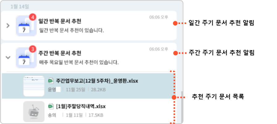 주기 문서 추천 알림에서는 일간, 주간, 월간 등 주기별로 추천된 주기 문서 목록을 볼 수 있고, 문서를