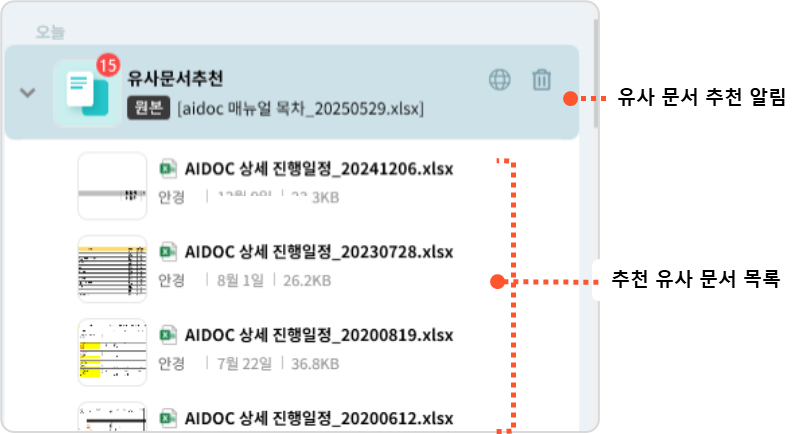 열람 문서의 유사 문서 추천 알림에서는 추천 유사 문서 목록을 볼 수 있고, 문서를