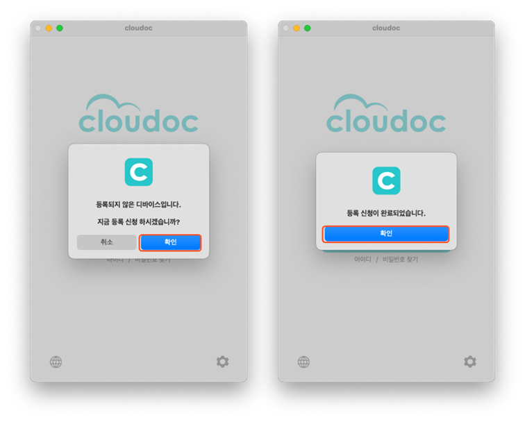 위한 알림 창이 표시됩니다. 이때 확인을 클릭하여 디바이스 등록을 신청합니다.