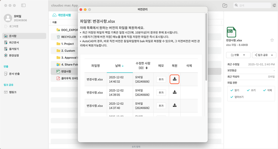 3. 복원을 재확인하는 메시지에서 확인을 클릭하면, 원본 파일이 위치한 폴더에 [원본 파일명_수정일시] 이름으로 파일이 복원됩니다.