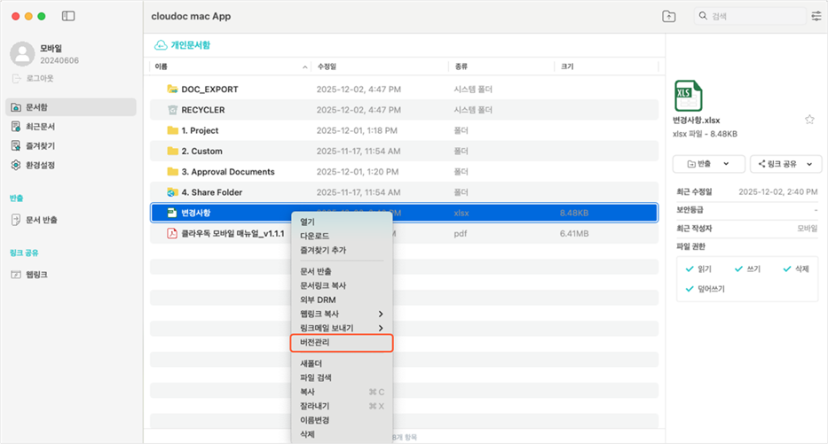 1. 문서함에서 복원할 파일 또는 복원할 파일이 위치한 폴더를 선택한 후, 마우스 우클릭하여 컨텍스트 메뉴에서 버전 관리를 선택합니다.