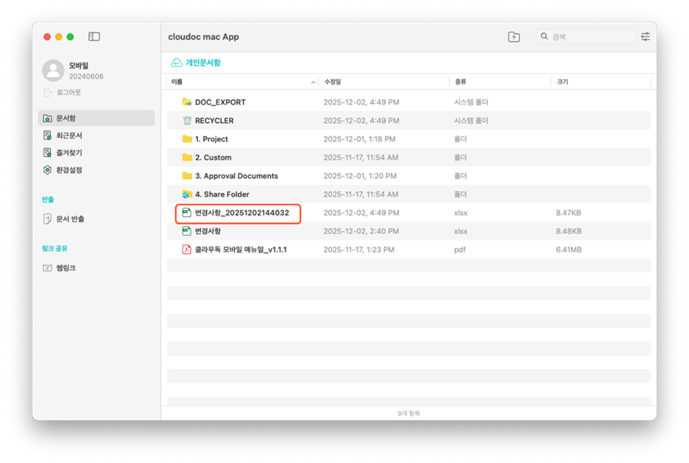 Mac 앱 소개 macOS에서도 솔루션의 다양한 기능을 이용할 수 있도록 Mac 앱이 제공됩니다. Mac 앱은 기본적인 파일 및 폴더 관리와 문서 작업, 검색 기능을 제공합니다. Mac 앱은 사용자 웹페이지에서 dmg파일을 다운받아 설치할 수 있습니다. 다음 동영상에서 Mac 앱의 개선된 기능을 확인할 수 있습니다. Mac 앱의 개선된 기능 _ 동영상 보기 Mac 앱 시작하기 Mac 앱을 처음 사용하기 위해서는 다음과 같은 과정이 필요합니다. ...