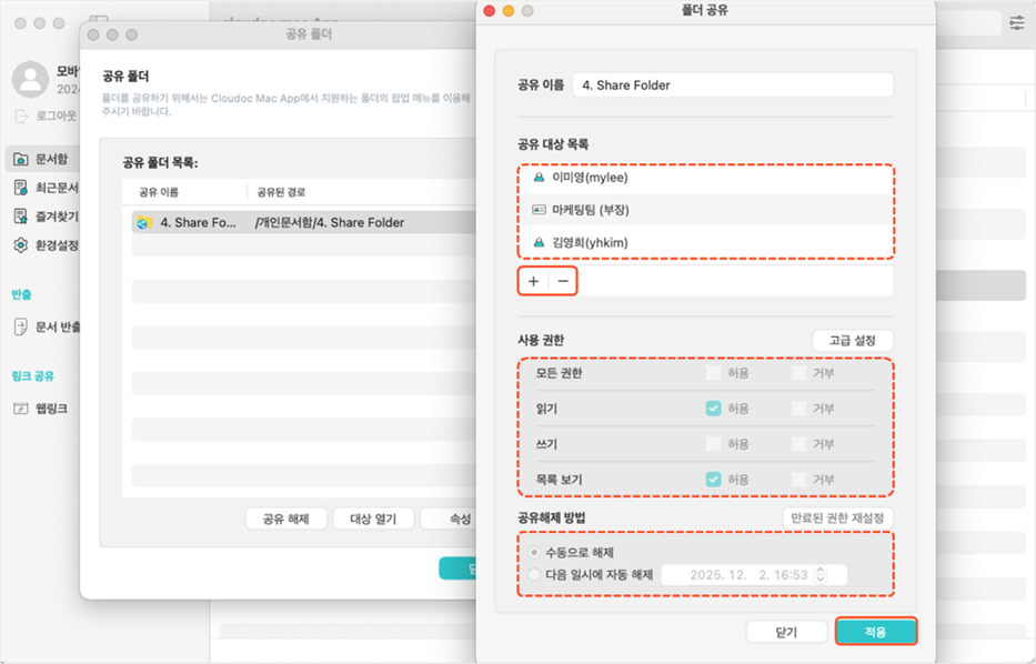 - 공유 설정을 변경하려면, 공유 대상을 선택하고 사용 권한 또는 공유 해제 방법을 변경한 뒤 적용 버튼을 클릭합니다.
