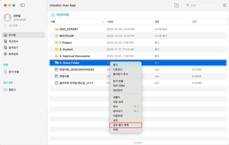 1. 문서함에서 공유 현황을 확인하고자 하는 폴더를 선택한 후 마우스 우클릭하여 공유 폴더 목록을 선택합니다.