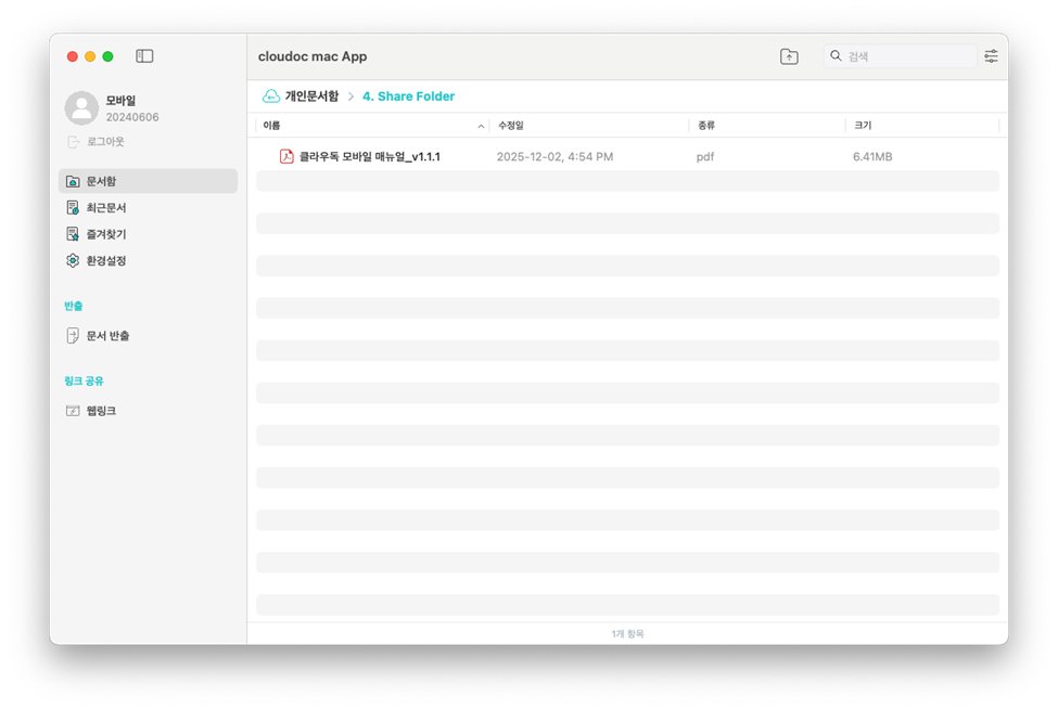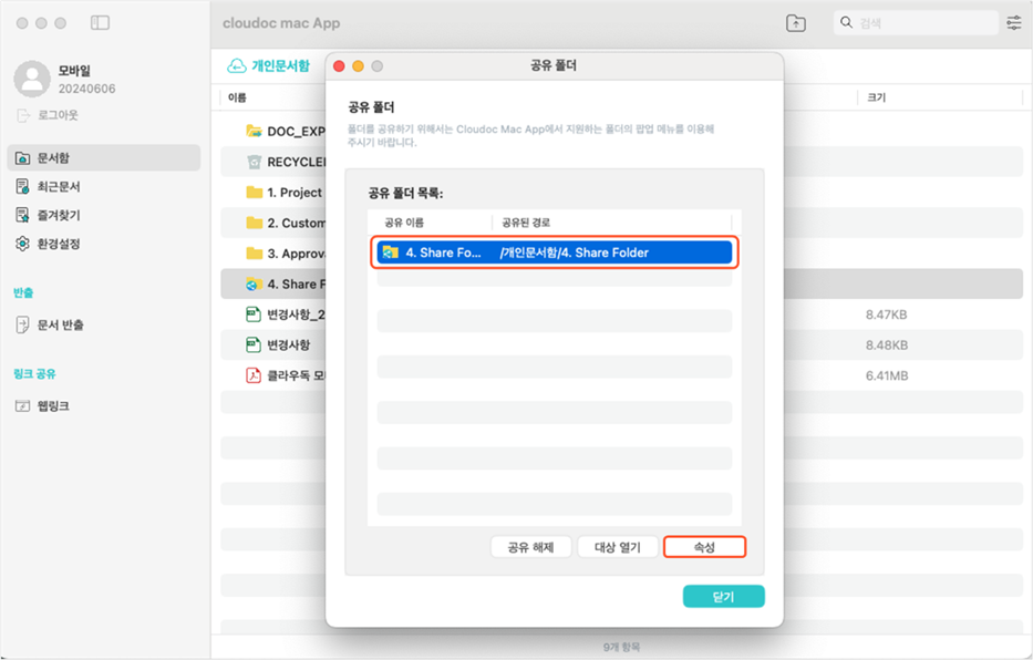 2. ‘공유 폴더’ 창의 공유 폴더 목록에 선택한 폴더가 속한 문서함에서 공유가 설정된 폴더의 전체 목록이 표시됩니다.