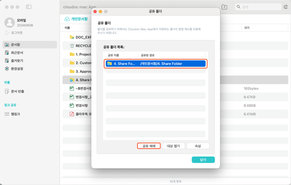 1. ‘공유 폴더’ 창의 공유 폴더 목록에서 공유를 해제할 폴더를 선택한 후 공유 해제 버튼을 클릭합니다.