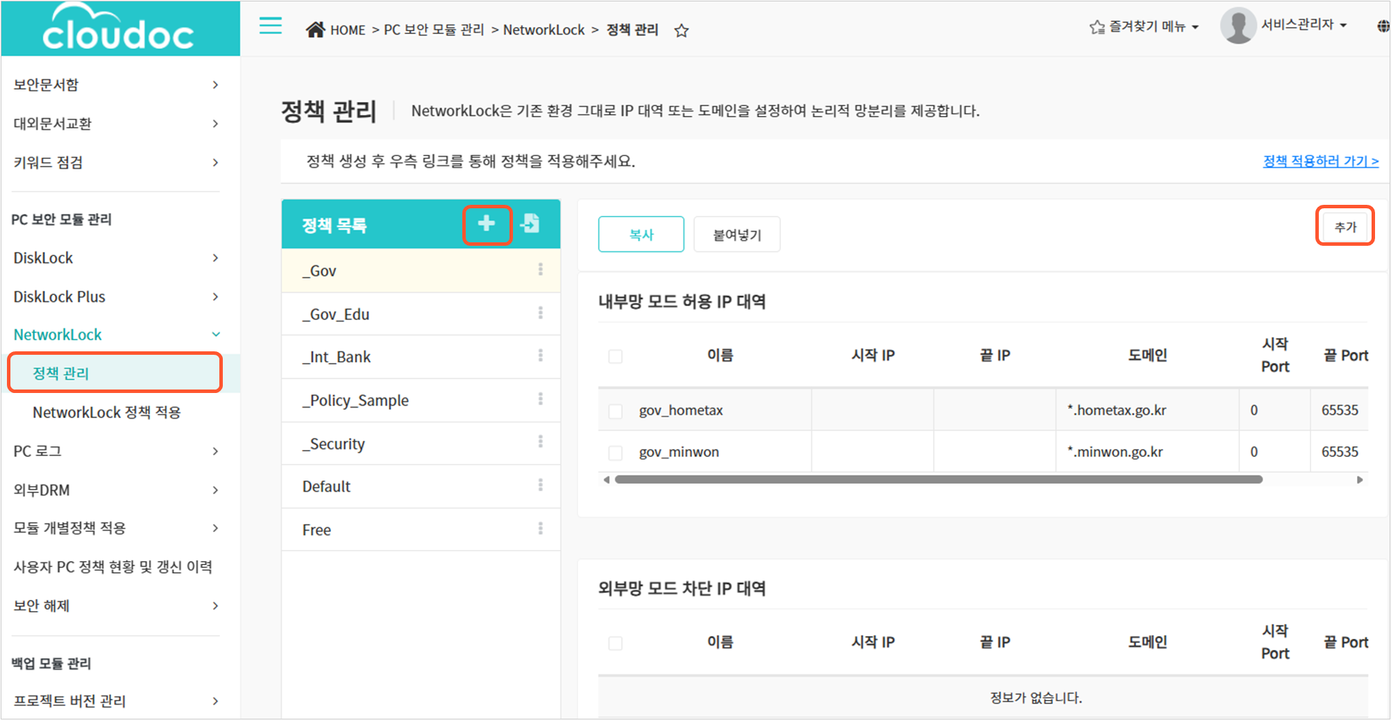 관리자는 사용자/부서별로 적용될 NetworkLock 정책을 추가, 변경, 삭제하고, 정책의 이름을 변경하거나 사본을 생성할 수 있습니다. 또한 설정된 정책을