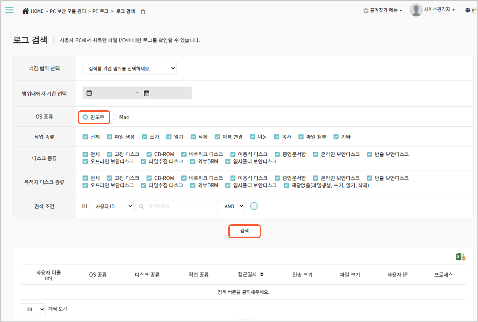 - OS 종류: 로그를 확인할 PC의 OS 종류를 윈도우, Mac 중에서 선택합니다.