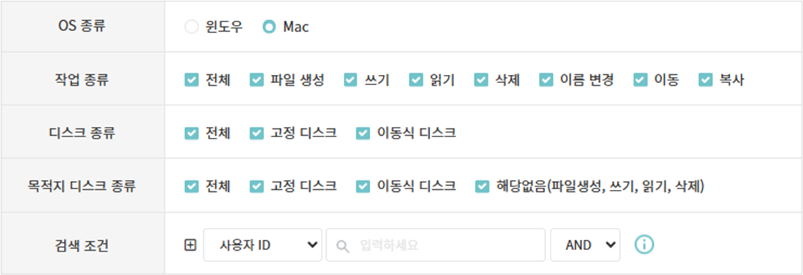 - 작업 종류: 파일 생성, 쓰기, 읽기, 삭제, 이름변경, 이동, 복사, 파일 첨부 등 로그를 확인할 파일 작업을 선택합니다.