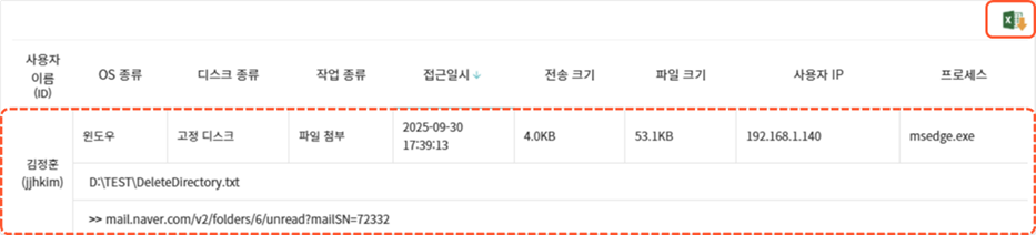- 1행: 사용자 이름과 ID, OS 종류, 디스크 종류, 작업 내용, 접근 시간, 전송 크기, 파일 크기, 사용자IP, 입출력 작업을 수행한 프로세스명을 확인할 수 있습니다. Mac PC 로그의 경우, 전송 크기와 프로세스명은 표시되지 않습니다.